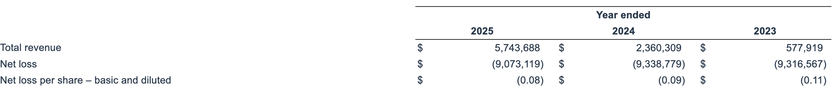 Operating expenses for 2025 were $7,355,302, compared to $6,688,824 in 2024, representing a 10% YoY increase. Loss from Operations for 2025 was $6,870,515 compared to $7,778,258 in 2024, which was a 12% YoY improvement. Net loss, which includes non-cash items, for 2025 was ($9,073,119), compared to ($9,338,779) in 2024.